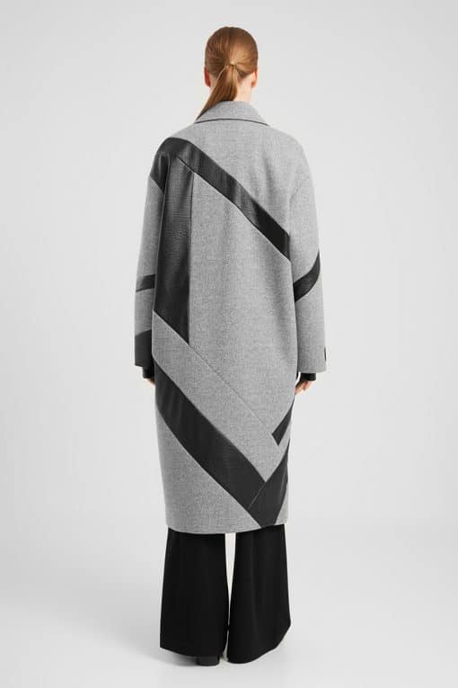 Crafted from a premium polyester and wool blend, this long coat features bold black vegan leather contrast lines and a signature Elsewhere patch label for added distinction. Its notched lapel and oversized silhouette create a modern, polished look, while the 3-button closure and side seam pockets offer practical elegance.